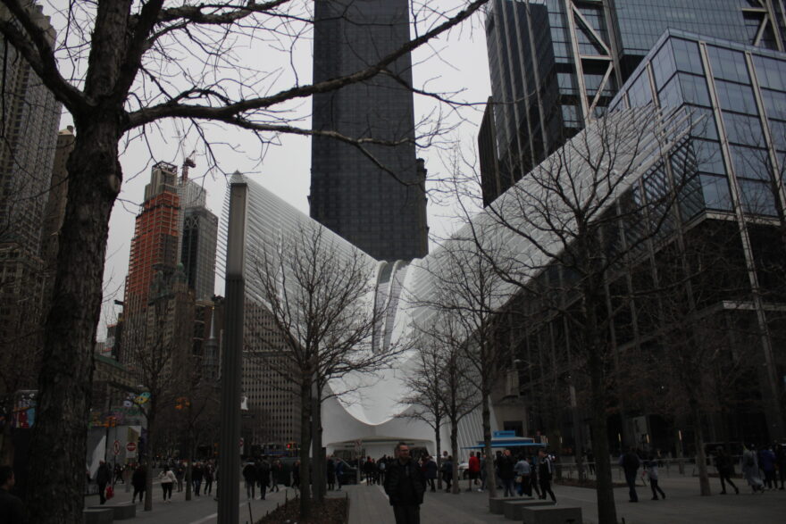 We entered the site through the Church Street, on the Fulton Street. While walking towards the memorial, along the Church Street, on the left there was Saint Paul Chapel. Leaving it behind we approached the Fulton Street. The first thing we saw was therefore the Oculus. The Oculus designed by architect Santiago Calatrava is one of a kind. It served as a metro station as well as a mall. Though devised a long time back it was constructed a lot later compared to the other structures there. This structure from outside was a bird ready to fly. At first the huge organic structure may seem a bit overwhelming.